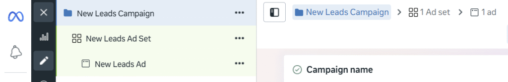 Ou, seguindo a hierarquia: Campanha > Conjunto > Anúncio.