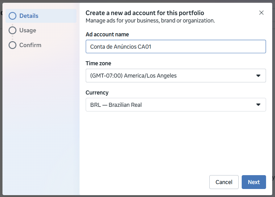 Dê um nome para sua nova conta de anúncios. Ajuste o time zone e a moeda. ATENÇÃO: você só pode configurar a moeda da conta (BRL, para Real Brasileiro) no momento de criação da conta, tome cuidado.
