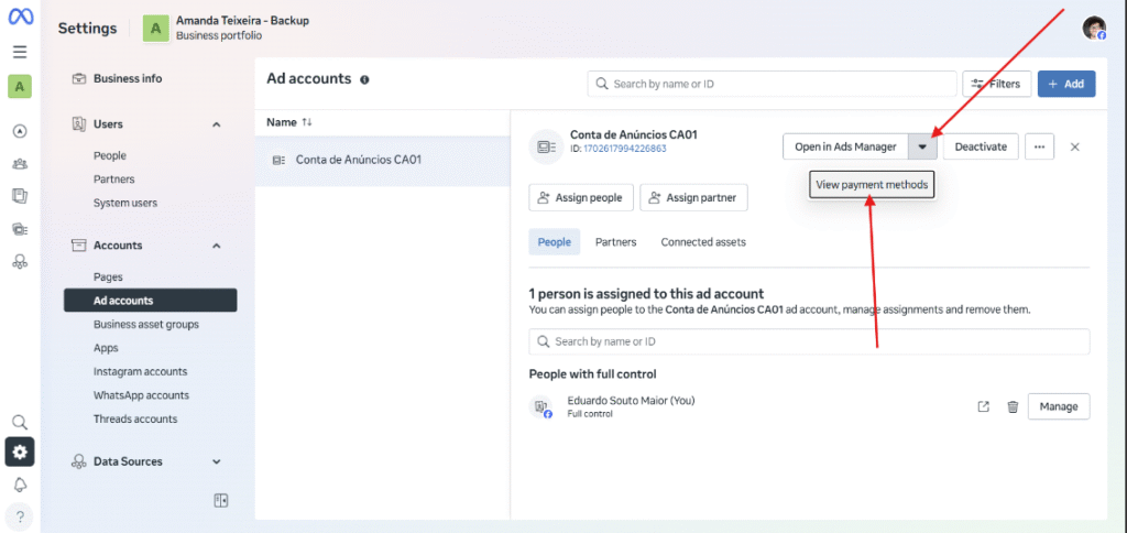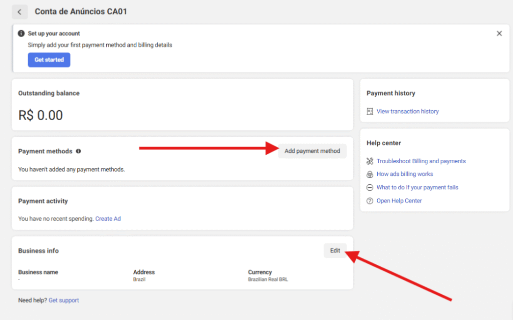 O próximo passo é configurar os métodos de pagamento para poder veicular anúncios. Então depois de criar sua conta de anúncios, atualize a tela apertando F5 para liberar o botão indicado abaixo. E agora é só navegar até “ver métodos de pagamento“