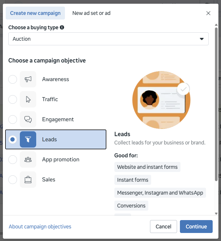 Nesse nível você define o objetivo principal da campanha. Por exemplo, é possível escolher gerar alcance, engajamento, tráfego, leads ou vendas.