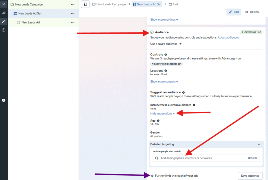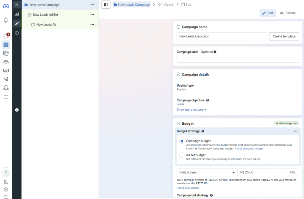 Aqui são configurados elementos como público, orçamento e posicionamentos. Além disso, também é nesse nível que você define como o algoritmo deve otimizar os resultados.