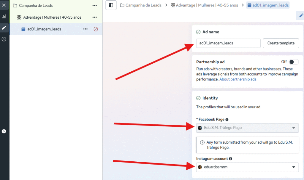 Após configurar público e orçamento, chega o momento de criar o anúncio. Dentro do anúncio, as primeiras configurações são o nome do anúncio e as contas que serão usadas para fazer a veiculação.