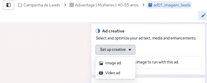 E mais abaixo ainda você pode escolher o criativo do seu anúncio