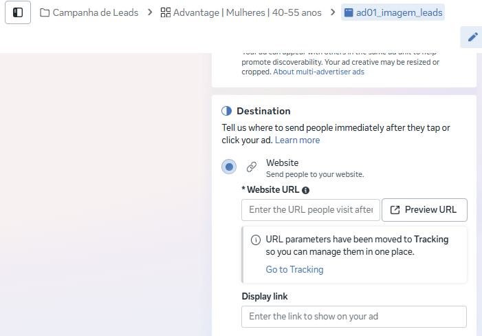 Mais abaixo você pode adicionar um link para seu anúncio, se o objetivo de campanha escolhido permitir.