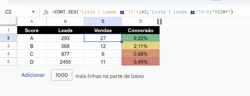 Aqui preferi fazer automático. Usando a Fórmula CONT.SES, que contabiliza quantos leads A, B, C e D possuem na Lista de Leads