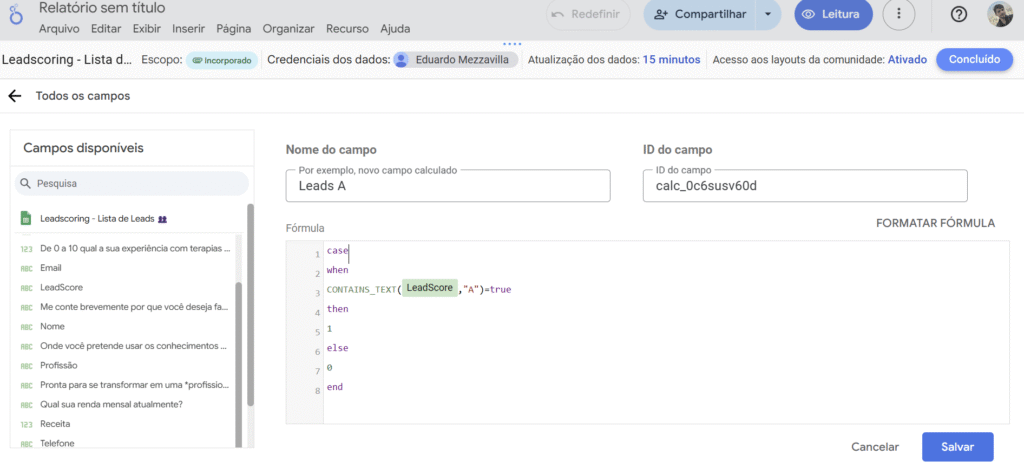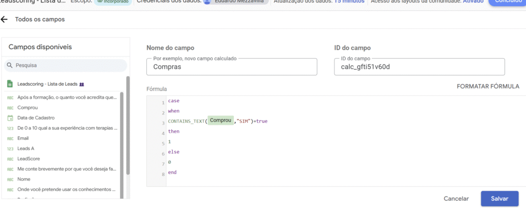 OBS: caso seu campo “LeadScore” não esteja escrito exatamente igual o meu, não basta copiar a fórmula acima, você precisa selecionar o seu campo de leadscore na lista de campos disponíveis, que fica na lista da esquerda no print acima.