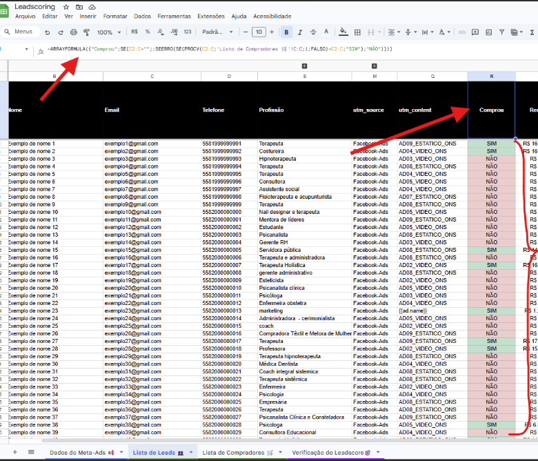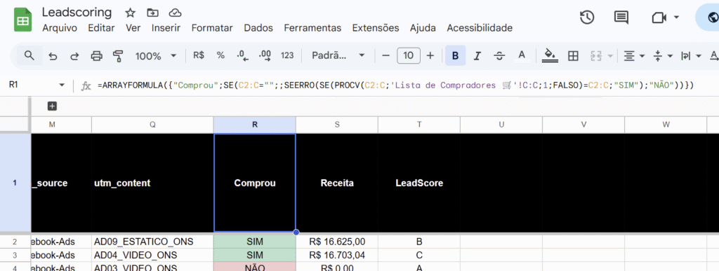 Perfeito, esta fórmula agora retorna SIM para todos os leads compradores e NÃO para leads não compradores.