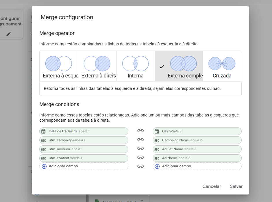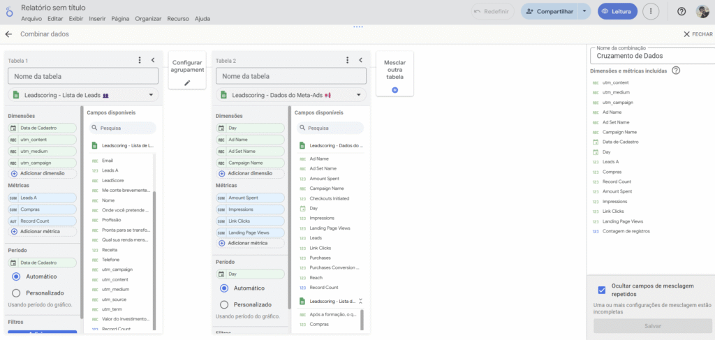 Portanto, nós devemos realizar uma Mesclagem entre as duas fontes de dados: uma possui os dados de investimento do Gerenciador de Anúncios a outra possui os dados de cadastro dos leads + UTMs + Leadscore + Informação se comprou ou não.
