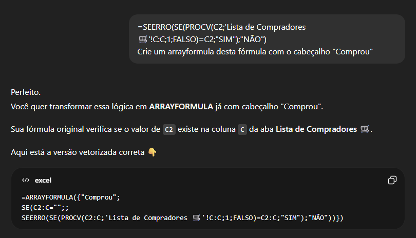Isso porque em vez de fazer uma formula para cada célula. Eu fiz apenas a da C2 e pedi para o ChatGPT criar um ARRAYFORMULA.