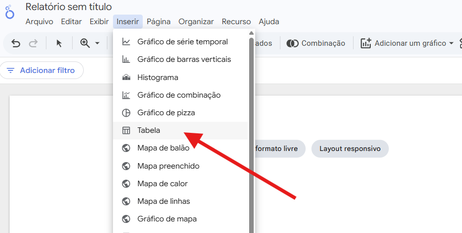 Arraste o mouse na tela para determinar o tamanho da sua tabela e ela será criada com uma Fonte de Dados aleatória. Clique na sua tabela para poder editá-la e em seguida troque a fonte de dados dela para a combinação que você acabou de criar.