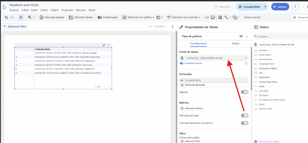 Ao selecionar a combinação como fonte de dados, você vai poder trocar as dimensões e métricas da tabela de acordo com a combinação que você fez.
