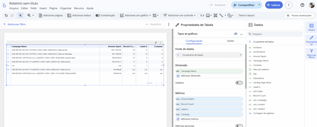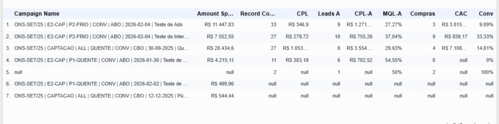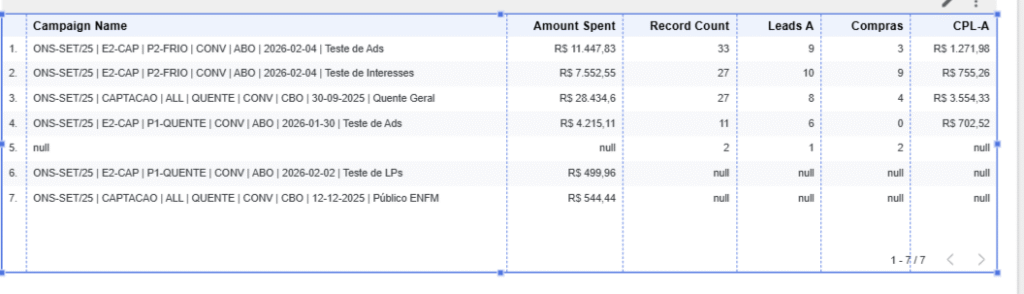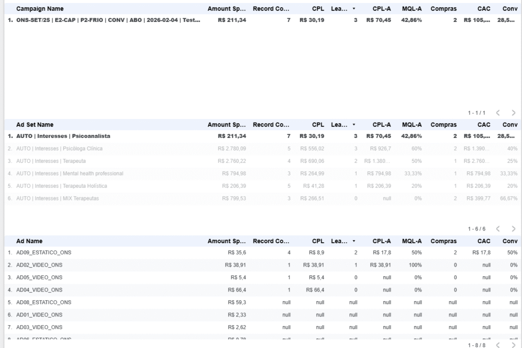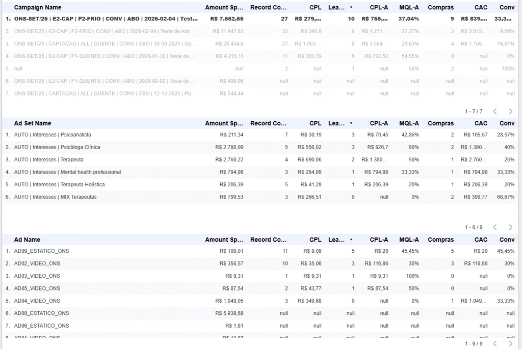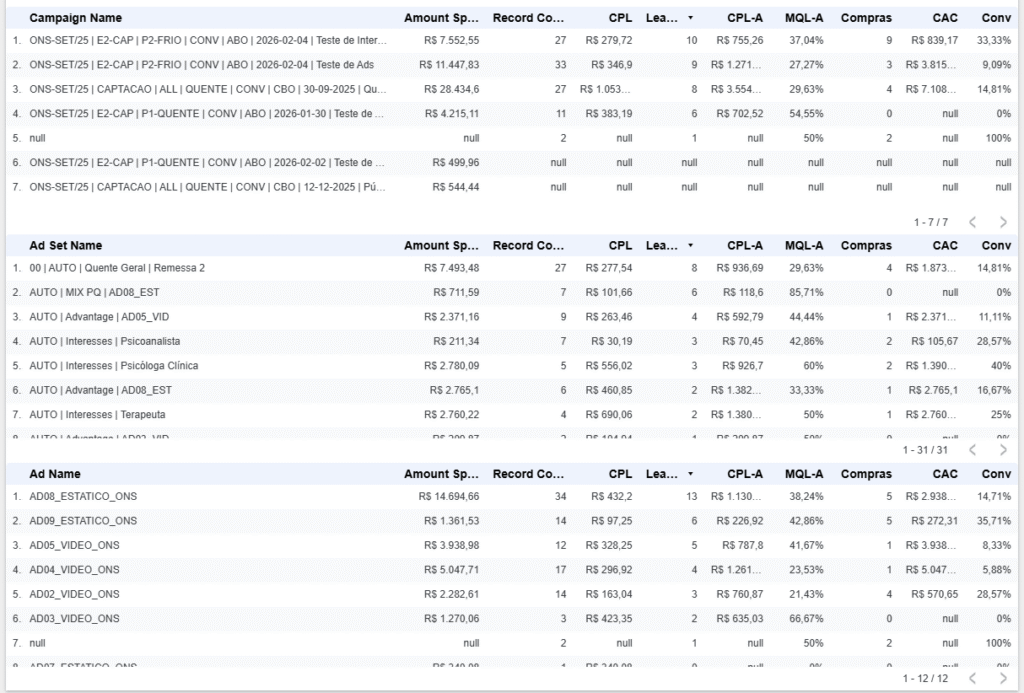 Estamos chegando ao fim. Agora falta apenas adicionar algumas tabelas no seu relatório com as métricas que desejamos: Campanha/Conjunto/Anúncio – Gasto, Leads, CPL, Leads-A, CPL-A, MQL-A, Compras, CAC e Conversão