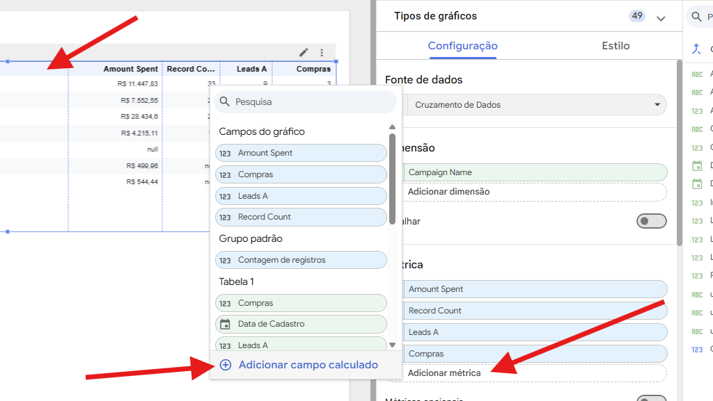 Nas Métricas da Lista de Leads, selecione os campos que você criou: Leads A e Compras. E selecione também o Record Count (contagem de registros). Na prática, ele é o número total de leads da sua planilha.