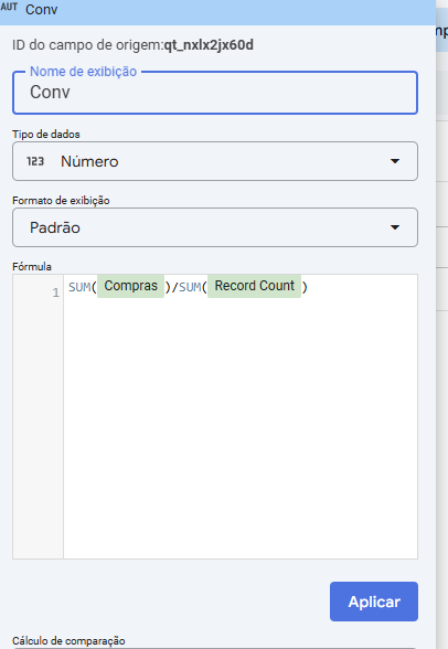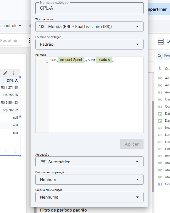 2 – Coloque o nome do Campo “CPL-A”. Na fórmula coloque o somatório do valor gasto e divida pelo somatório dos Leads-A. Configure o tipo de dados (moeda, porcentagem, número, etc) e clique em Aplicar