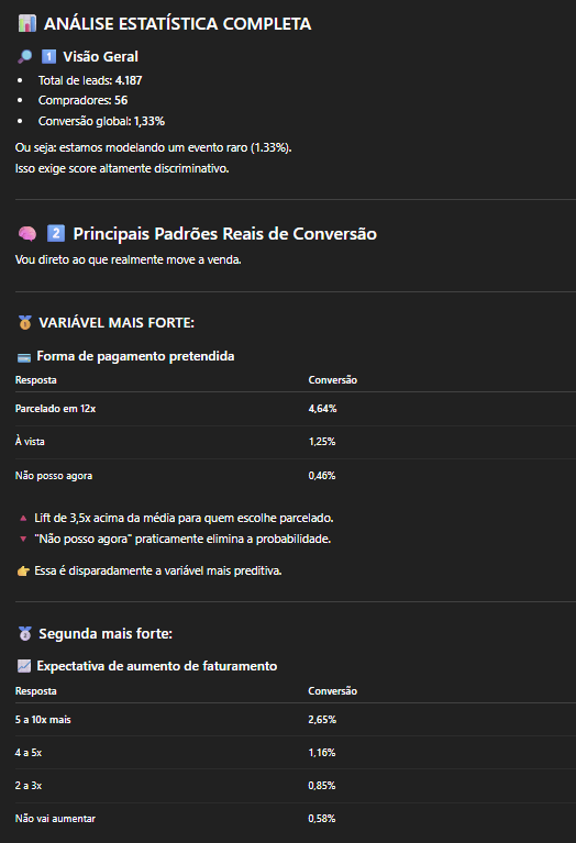 Aqui o trabalho começa a ficar menos manual. Você só deve enviar sua lista de leads COM AS RESPOSTAS DA PESQUISA e MARCAÇÃO DE VENDA e pedir para o GPT encontrar padrões de conversão.