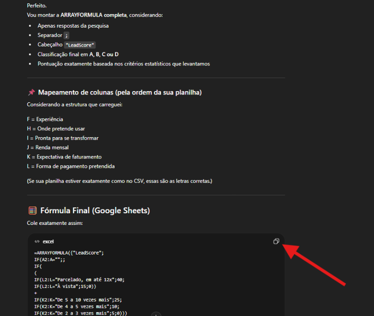 3. Pedir ao Chat GPT que crie uma fórmula do Sheets que atribua uma nota para cada Lead