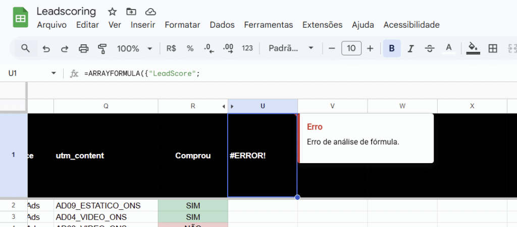 Avance para a próxima etapa somente quando você conseguir fazer a fórmula funcionar. No meu caso, colei a fórmula na Célula T1, e ela “cuspiu” uma nota para cada lead gerado.