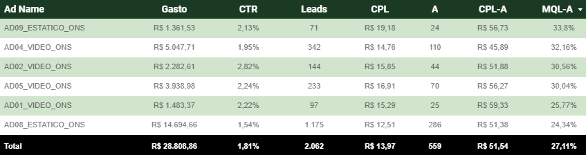 A coluna “A” mostra a quantidade de leads nota A por anúncio e ao lado dela temos o custo por lead A. Dessa forma, escalamos os anúncios que trazem mais leads nota A