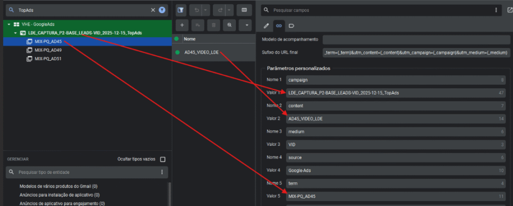 No Google Ads, é necessário inserir manualmente os parâmetros. No Google Ads Editor, a configuração fica na área de anúncios, em “Parâmetros Personalizados”.
