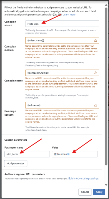 utm_source=Meta-Ads&utm_medium={{adset.name}}&utm_campaign={{campaign.name}}&utm_content={{ad.name}}&utm_term={{placement}}