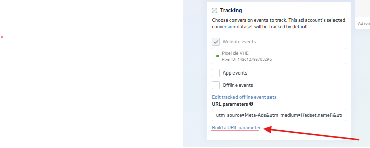 Para configurar as UTMs Dinâmicas no Meta-Ads, clique em “Construir um Parâmetro de URL“, onde aponta a seta da imagem abaixo