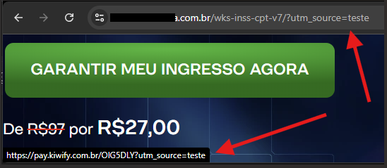 Se o parâmetro aparecer no link do checkout, significa que as UTMs estão sendo transmitidas corretamente.